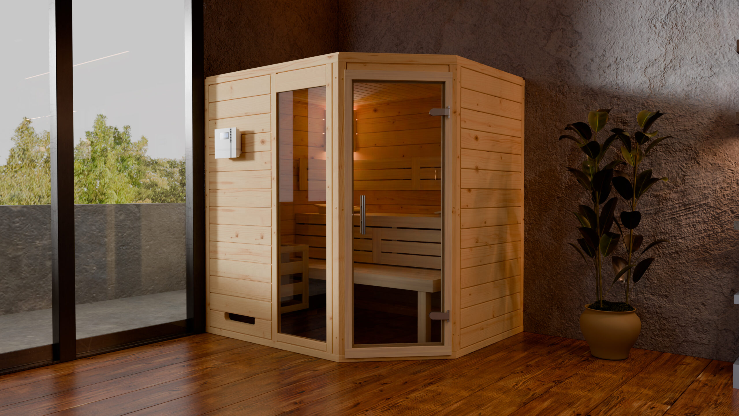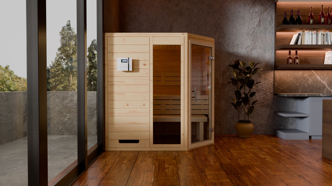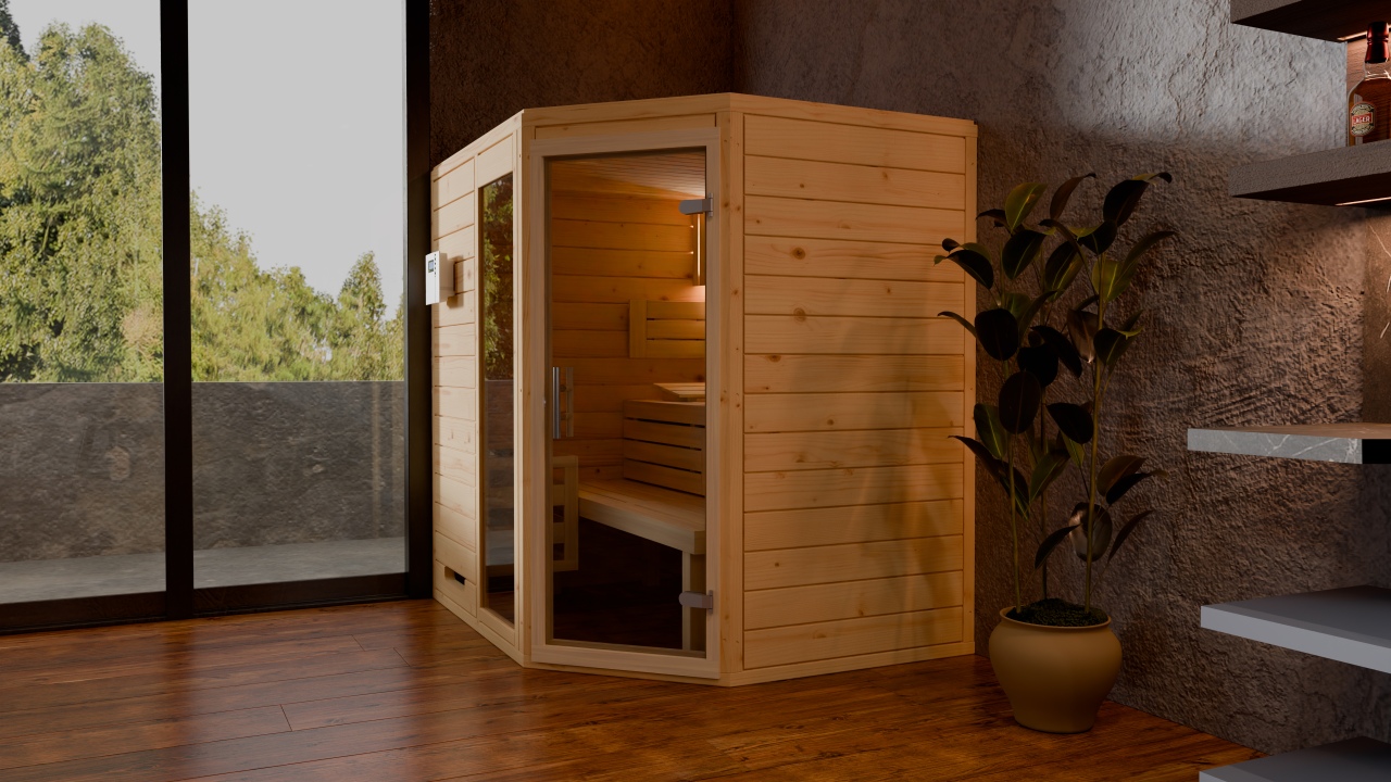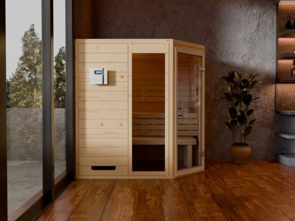 Das 5-Eck-Design macht die Sauna besonders flexibel einzusetzen – ideal für Wohnzimmer, Badezimmer oder speziell eingerichtete Saunaräume mit begrenztem Platz. Dank ihrer robusten Holzstruktur garantiert sie eine hervorragende Wärmespeicherung, gleichmäßige Wärmeverteilung und ein natürlich angenehmes Saunaklima.
