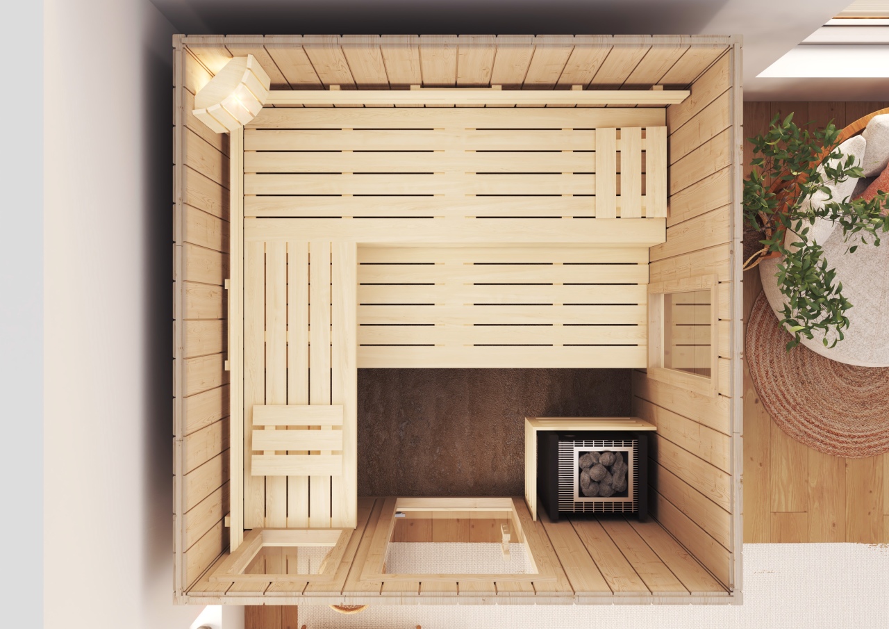 Dank ihres 4-Eck-Designs nutzt die Sauna den verfügbaren Raum optimal und eignet sich besonders für Wohnungen, Häuser oder Wellnessräume mit begrenztem Platz. Die Innensauna Indoor ist aus hochwertigem Holz gefertigt, das für exzellente Wärmespeicherung sorgt und eine natürliche, beruhigende Atmosphäre schafft. Durch das zeitlose Design fügt sich diese Sauna harmonisch in jede Einrichtung ein.
