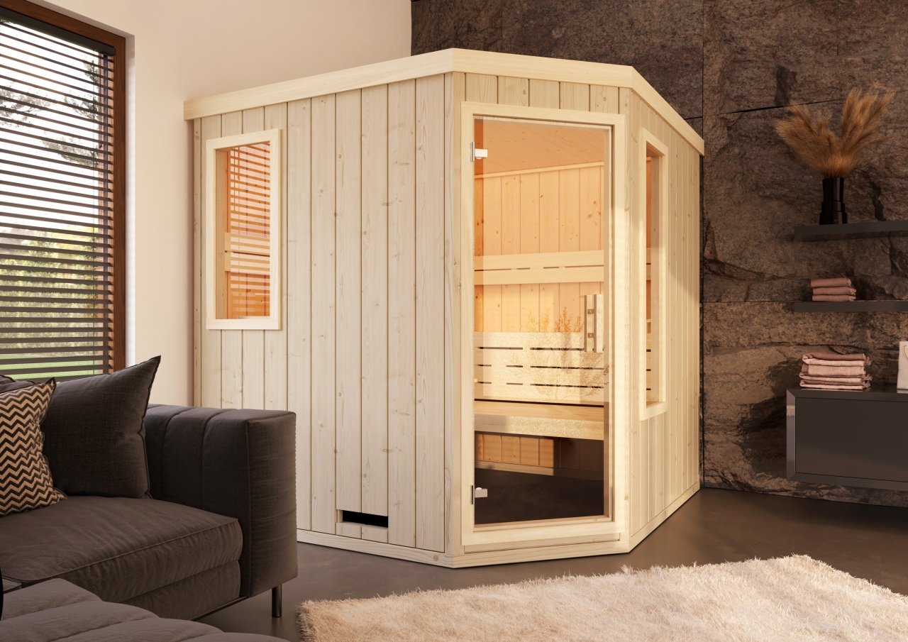 Die Premium Innensauna Lena 5-Eck überzeugt durch ihr platzsparendes 5-Eck-Design, hochwertige Holzverarbeitung und angenehmes Saunaklima – ideal für alle, die eine Innensauna für zuhause kaufen möchten.